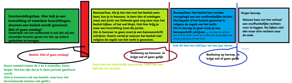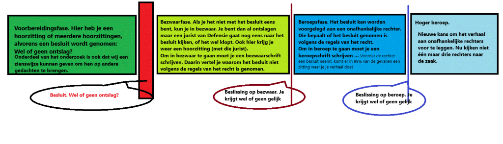 Bezwaar tegen ontslag wordt overigens behandeld op de Kromhoutkazerne in Utrecht. De procedure bij de rechter wordt behandeld bij de rechtbank Den Haag.